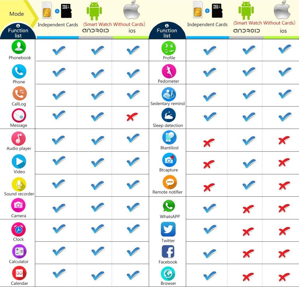 Si utilizamos otro modo en el reloj que en este caso, es un modo en el que el propio reloj lleva una tarjeta SIM y una tarjeta de memoria MicroSD, podemos utilizar el dispositivo como reloj independiente sin necesidad de utilizar nuestro smartphone. En la imagen superior se puede observar una tabla con el número de funcionalidades que encontramos según el modo que estemos utilizando el reloj así como la compatibilidad de funciones con iphone o smartphone Android.